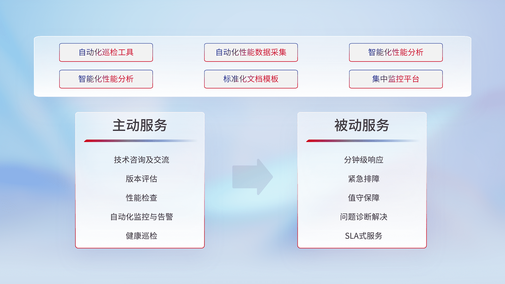 智能化工具和标准化文档,,,保障服务质量,,提供主动服务(包含技术咨询、、、版本评估、、、性能检查、、、自动化监控与告警、、、、健康巡检)和被动服务包含(分钟级响应、、紧急排障、、值守保障、、、问题诊断解决、、SLA服务)。。。