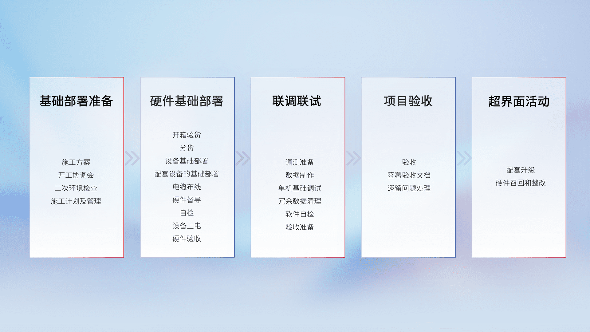 从基础部署准备、、硬件基础部署、、、、联调联试、、、项目验收、、越界面活动的全过程可追溯,,保证施工质量和进度。。。。