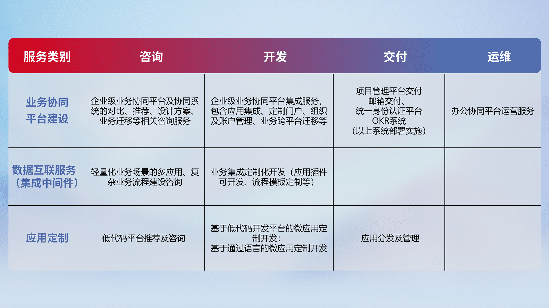 针对钉钉、、企微、、IDaas等平台级产品提供产品的规划、、、方案、、、、交付、、定制化开发等服务,,实现如统一协同办公、、、智能客户服务、、、、混合会议管理、、、、智能数据查询、、、等业务场景,,,实现数字化转型。。。。